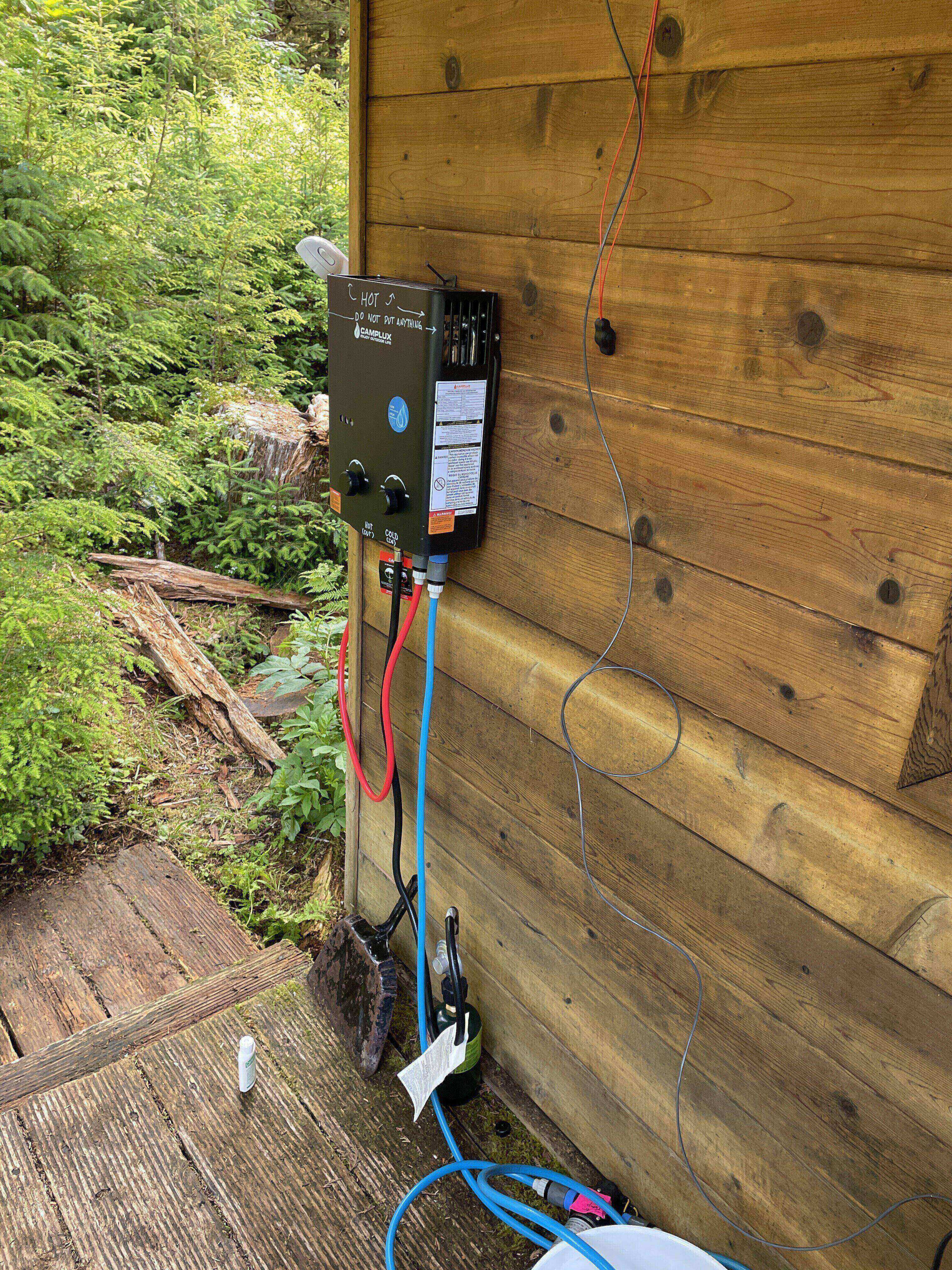 One of the main contributions I brought to the party was a water retrieval system to pump water from a nearby stream to the cabin, and a portable propane camp shower. Both systems operated with diaphragm pumps, and were designed to be easily hiked in and out.